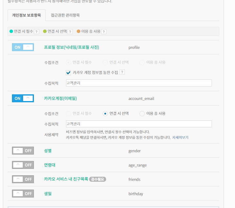 - 저같은 경우는 이메일 정보랑 고객 이름만 필요하기 때문에 ON으로 설정한후 저장을 하겠습니다.