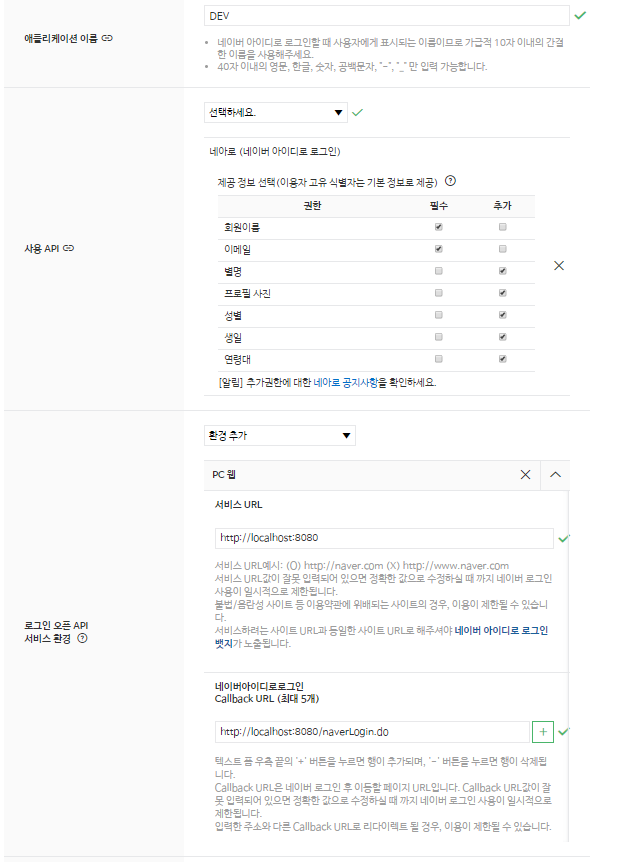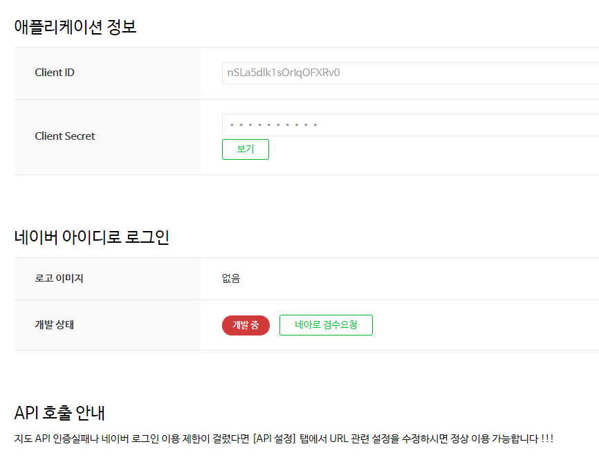 - 위 사진과 같이 입력후 등록을 하셨다면 API를 호출할때 쓰는 Client ID와 Client Secret을 발급 받게 됩니다.