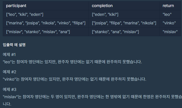 마라톤에 참여한 선수들의 이름이 담긴 배열 participant와 완주한 선수들의 이름이 담긴 배열 completion이 주어질 때, 완주하지 못한 선수의 이름을 return 하도록 solution 함수를 작성해주세요.