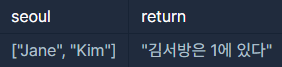 String형 배열 seoul의 element중 "Kim"의 위치 x를 찾아, "김서방은 x에 있다"는 String을 반환하는 함수, solution을 완성하세요. seoul에 "Kim"은 오직 한 번만 나타나며 잘못된 값이 입력되는 경우는 없습니다.