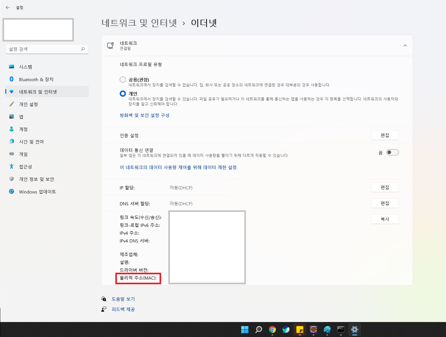 1. 네트워크 및 인터넷 > 이더넷에 들어가서 물리적 주소를 확인하면 된다. (window10 동일)